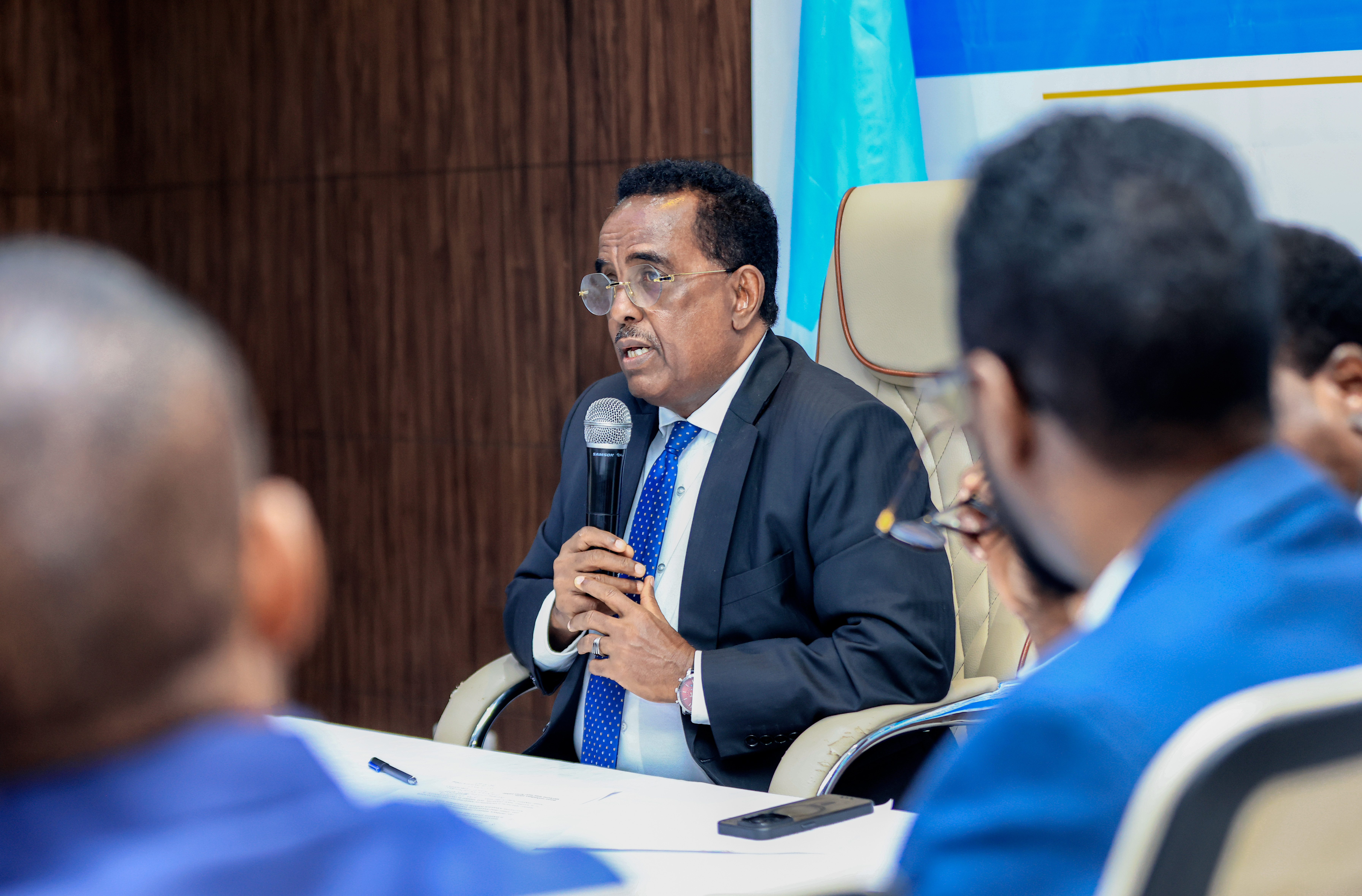 Muqdisho 08 Dec 2025; Wasiirka Wasaaradda Arrimaha Gudaha, Federaalka iyo Dib u heshiisiinta XFS mudane xildhibaan Cali Yuusuf Cali (Xoosh) ayaa guddoomiyey kulanka Iskuduwidda howlaha Dowladaha hoose.