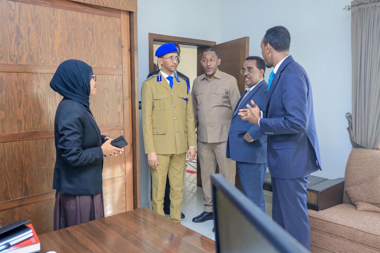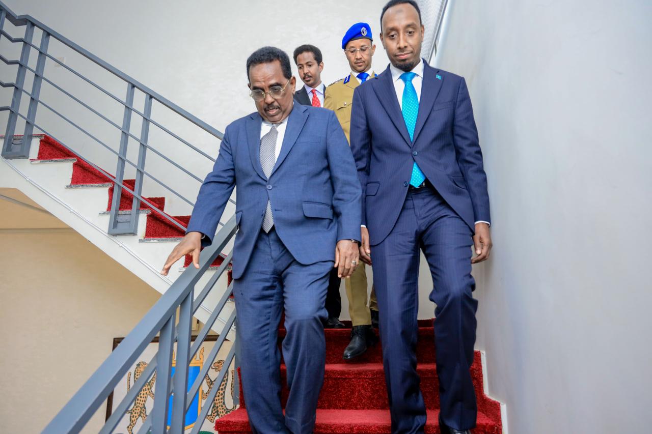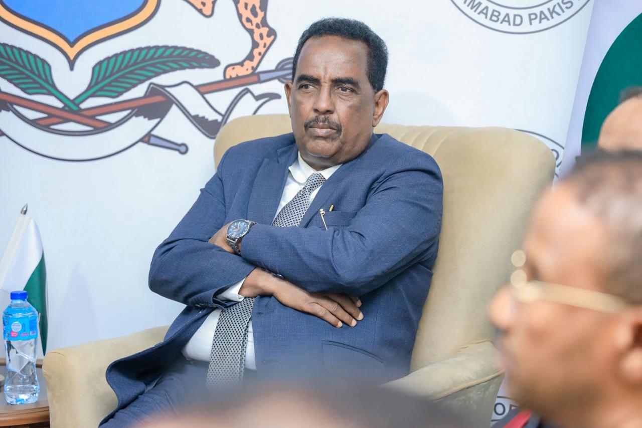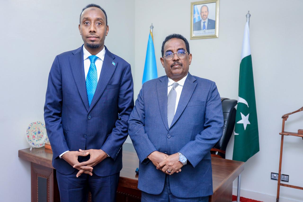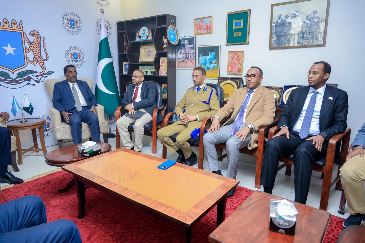 This afternoon, the Minister of Interior, Federal Affairs, and Reconciliation, H.E. Ali Yusuf Ali Hosh paid a courtesy visit to the Embassy of the Federal Republic of Somalia in Islamabad during his official visit to the Islamic Republic of Pakistan.